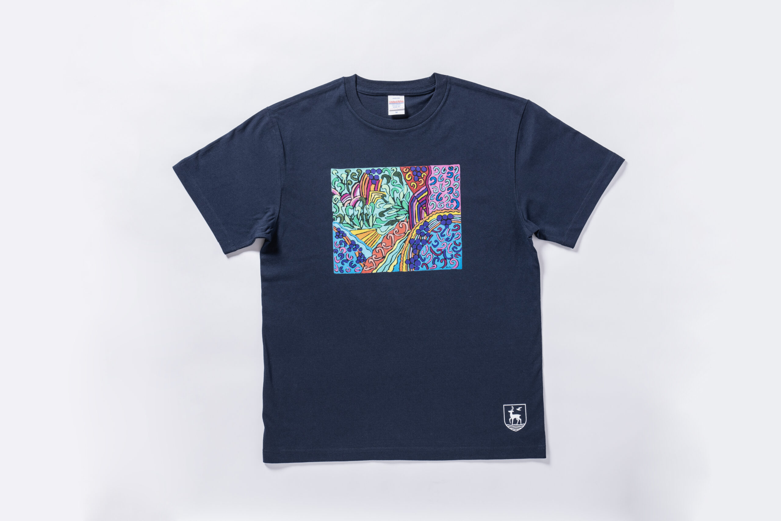 アトリエひふみよのアーティスト山本春香が描いた「ワインのたからばこ」をあしらったアートTシャツ。キャンバスの四角の中にワインを飲んだ時の気持ちやワインの宝石のようなものをたくさん描き込みました。